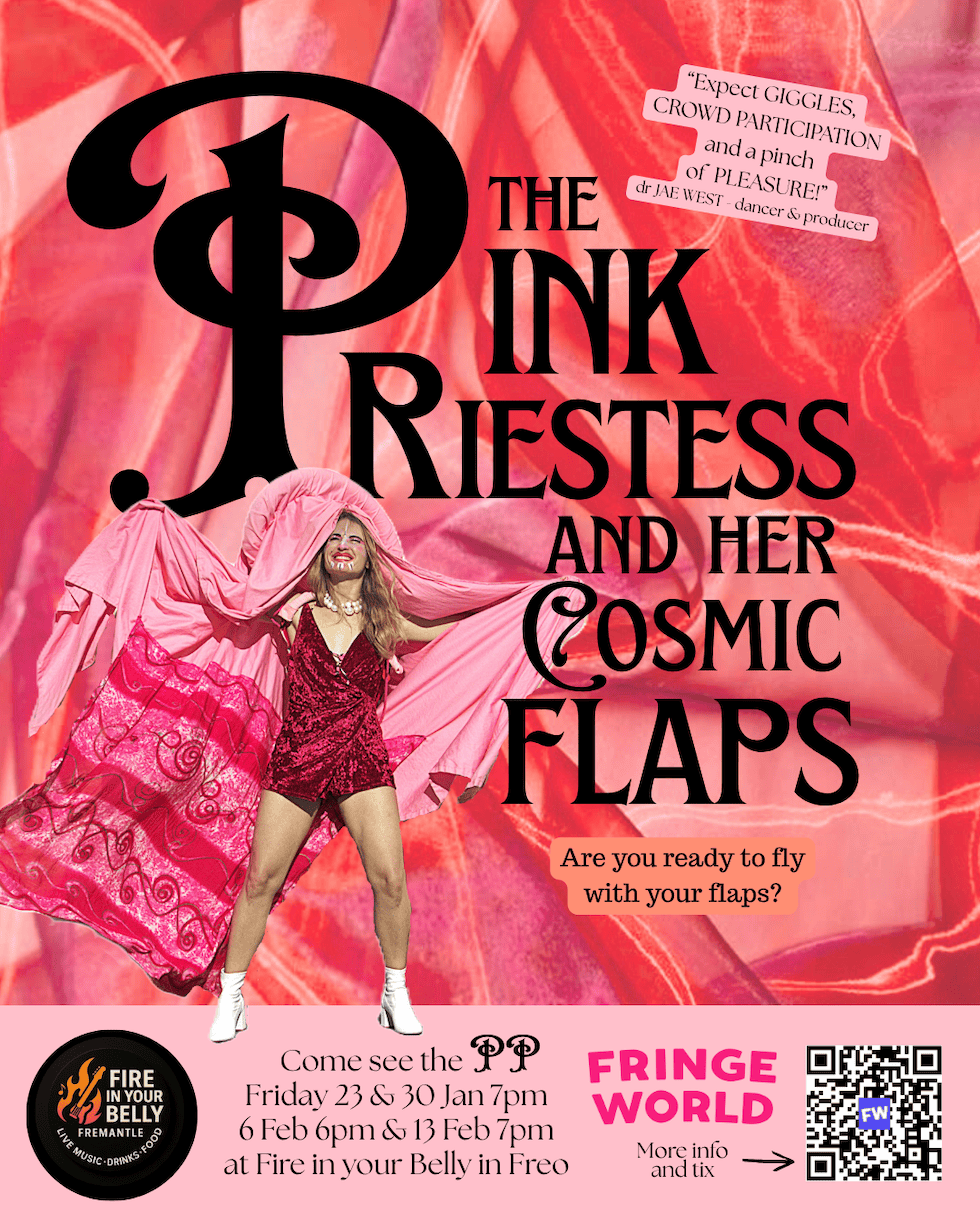 The Pink Priestess and her Cosmic Flaps hits Belly of the Beast at Fire In Your Belly from Friday, January 23, to Friday, February 13, 2026. Tickets are on sale now from fringeworld.com.au