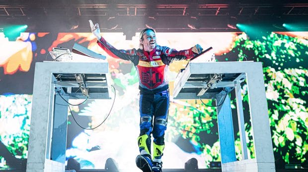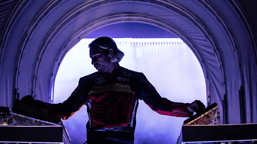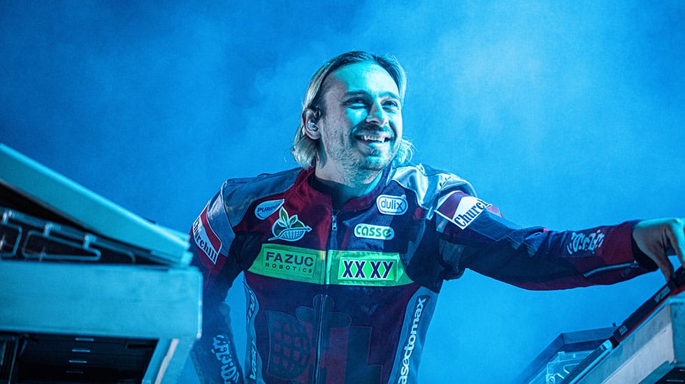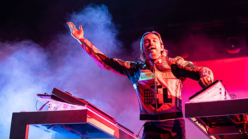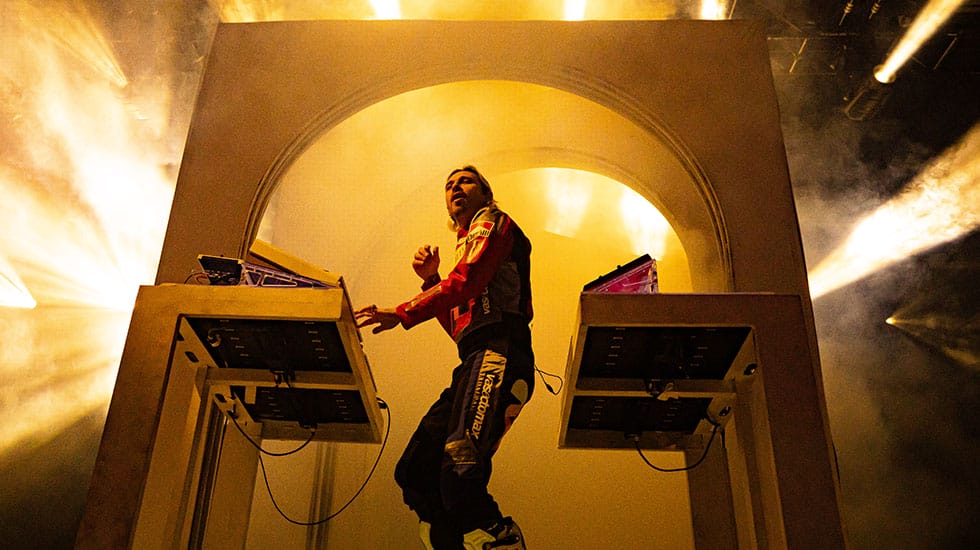 Fresh off the release of his fourth studio album Palaces, Flume entered the stage garbed in a race car driver’s suit. Loud car engine sounds ricocheted across the amphitheatre as a multi-coloured tyre appeared on the large screen behind him, then the wheel started spinning as the revving engine became more intense. The high-octane introduction then morphed into Flume’s opening song, Holdin On. The crowd was in, with everyone singing and invested, but unfortunately the night failed to deliver from there.