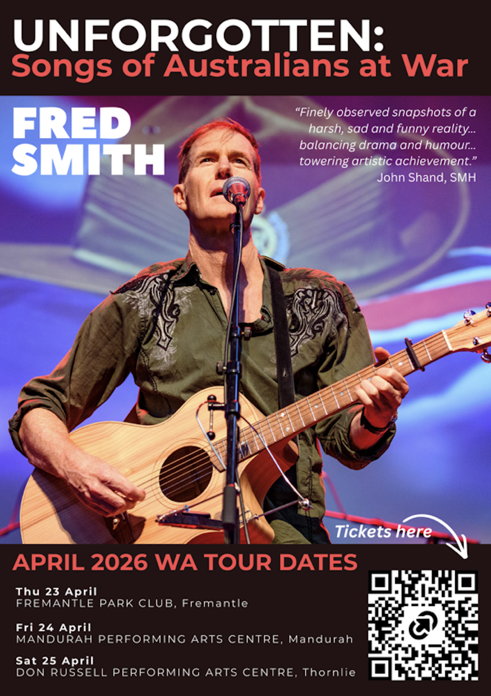 Fred Smith brings Unforgotten: Songs of Australians at War to Fremantle Workers Club on Thursday, April 23; Mandurah Performing Arts Centre on Friday, April 24; and the Don Russell Performing Arts Centre on Saturday, April 25, 2026. Tickets are on sale now.