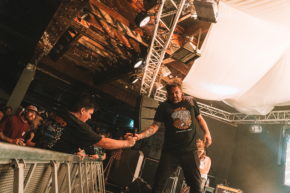 If Spacerhead’s pressure felt close to imploding inward, Last Quokka turned all that force outward, explosively involving the entire room. From the opening Gina Rinehart / Rupert Murdoch anthem, the band framed the night around class—not as abstract ideology, but as lived condition. Trent Rojahn wasted no time collapsing the distance between stage and floor, vaulting the barrier early and weaving through the crowd with mic cable trailing dangerously behind him. If the audience wouldn’t come forward, he brought the confrontation to them.