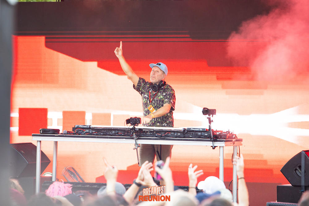 While the main stage understandably drew the lion’s share of the crowd most of the day/night, the Garden stage was a nice respite with more space and shade and still plenty of great tunes. Another legendary local duo doing damage on the dancefloor was BAA (Break-Aholics Anonymous), aka Ben Mac and Tone, who used to host an infamous vinyl-only night at Ambar. With Breakfest mascot Stumpy on the screen behind them (and a giant inflatable version looming overhead on the roof), their heavy-hitting brand of breaks even encouraged a dinosaur onto the dancefloor!