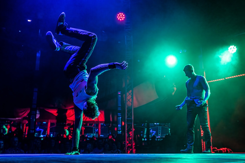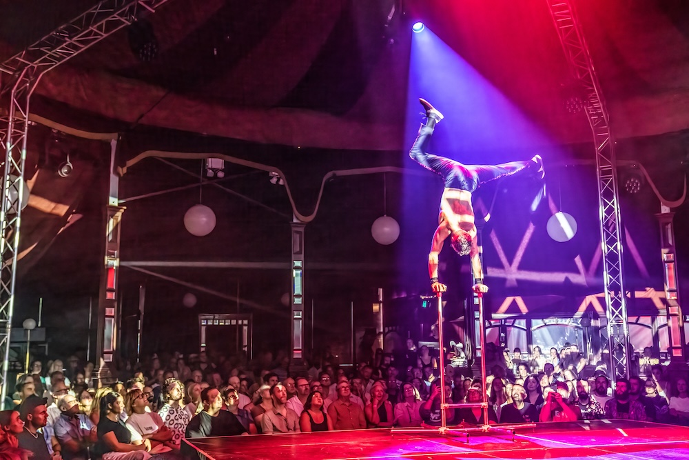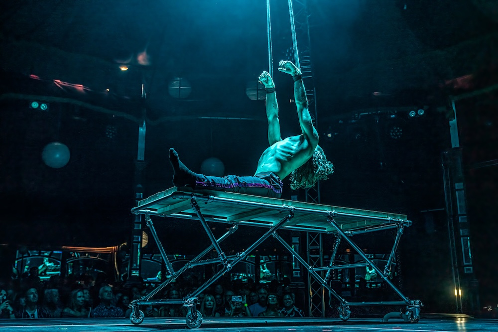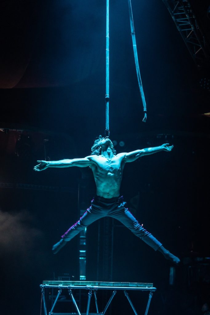As the trio levelled up, so did the stunts. Highlights included a flip-filled teeterboard routine, a trapeze sequence with a performer suspended by nothing but a mouthpiece, a tangle and twirl rope sequence rising up to the apex of the tent, and, unforgettably, a heart-stopping knife-throwing act that had blades landing mere inches from the acrobats’ dancing bodies.
