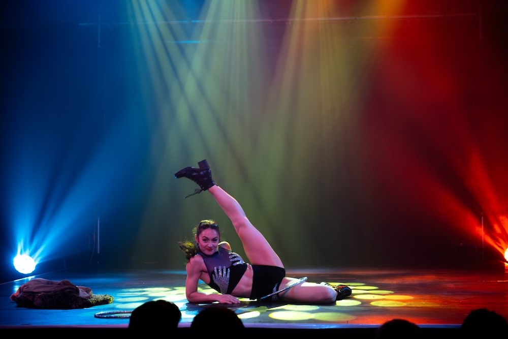 Queenslander Chelsea Angell brought two different acts with two sizes of hula hoops. The more challenging of these was the set only slightly wider than her hips that she somehow contorted around various combinations of limbs and body, as if an old-school Las Vegas magician caught in a variety of locks and chains.