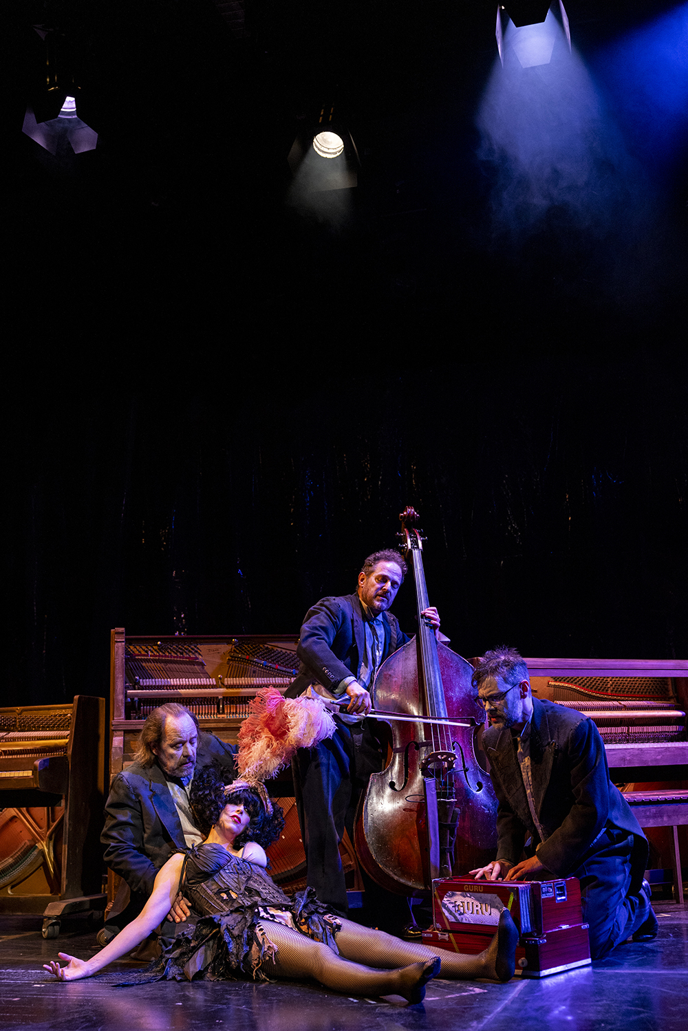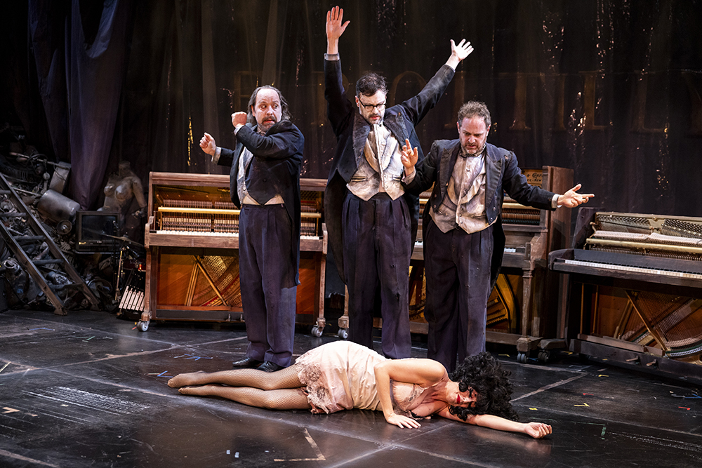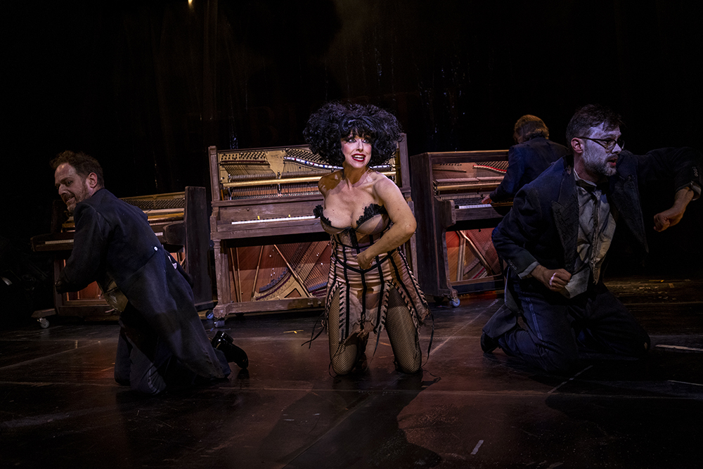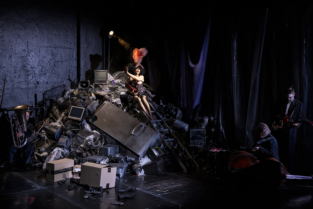 The audience entered His Majesty’s Theatre to a staticky radio that played show tunes and big band themes from approximately a century ago, with half the stage awash with the detritus of the current day, easily an entire street’s worth of council verge collection. Tonight’s band—Mark Jones, Dan Witton, and Jethro Woodward—came to the fore, dusty and careworn, twirling three upright pianos between them as if marching batons before literally dragging Meow out into the spotlight.