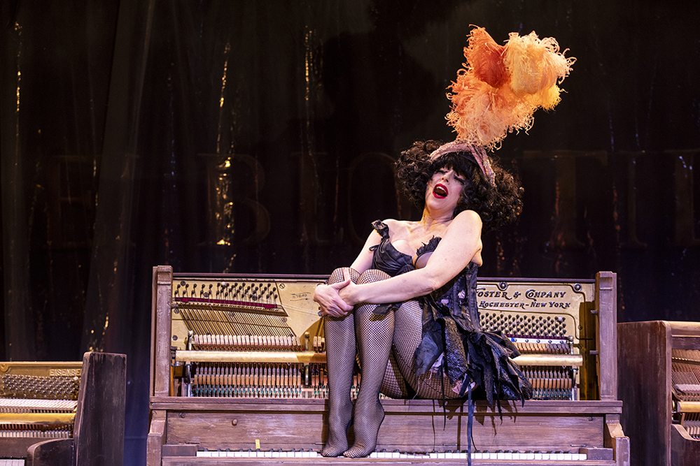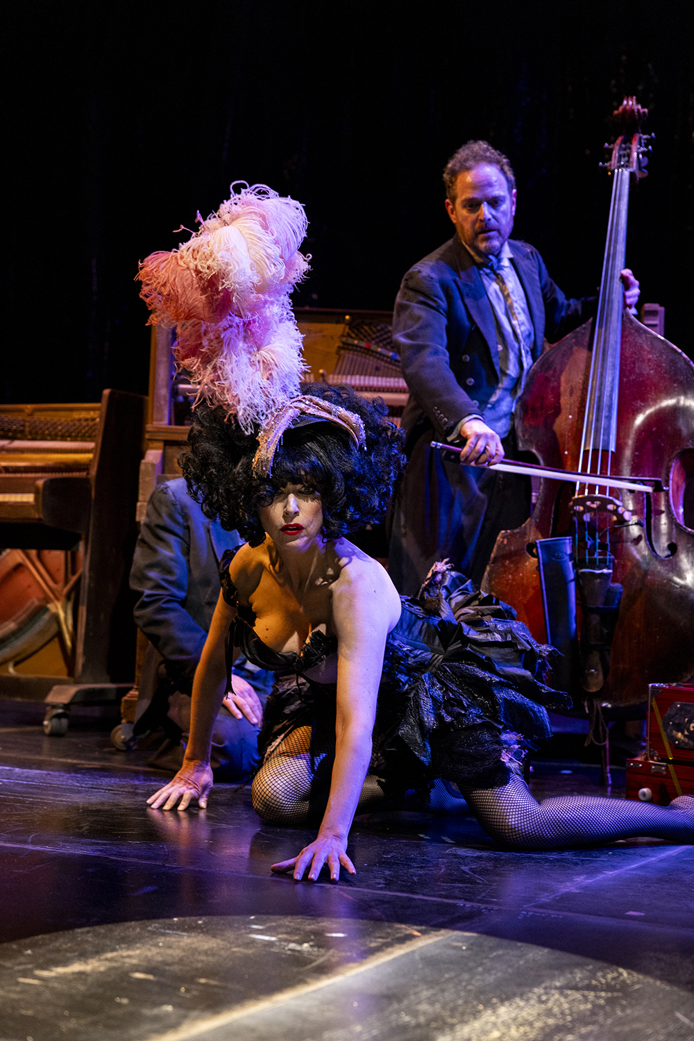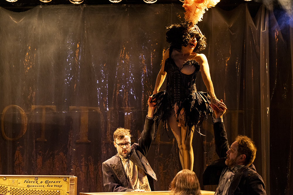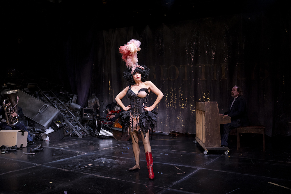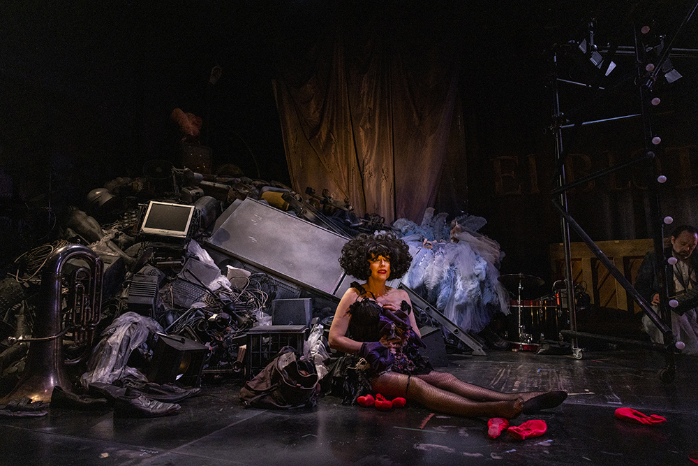 The audience entered His Majesty’s Theatre to a staticky radio that played show tunes and big band themes from approximately a century ago, with half the stage awash with the detritus of the current day, easily an entire street’s worth of council verge collection. Tonight’s band—Mark Jones, Dan Witton, and Jethro Woodward—came to the fore, dusty and careworn, twirling three upright pianos between them as if marching batons before literally dragging Meow out into the spotlight.