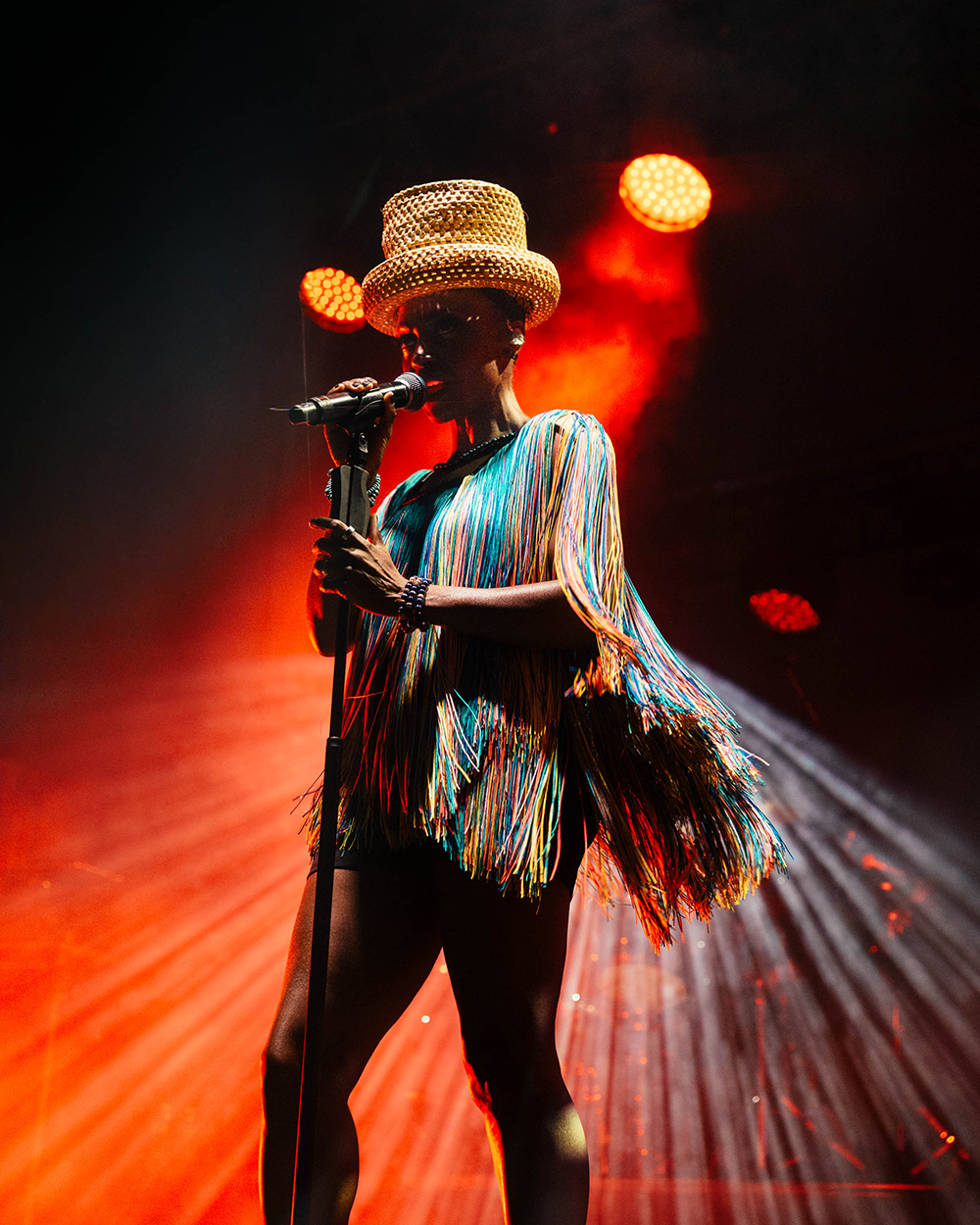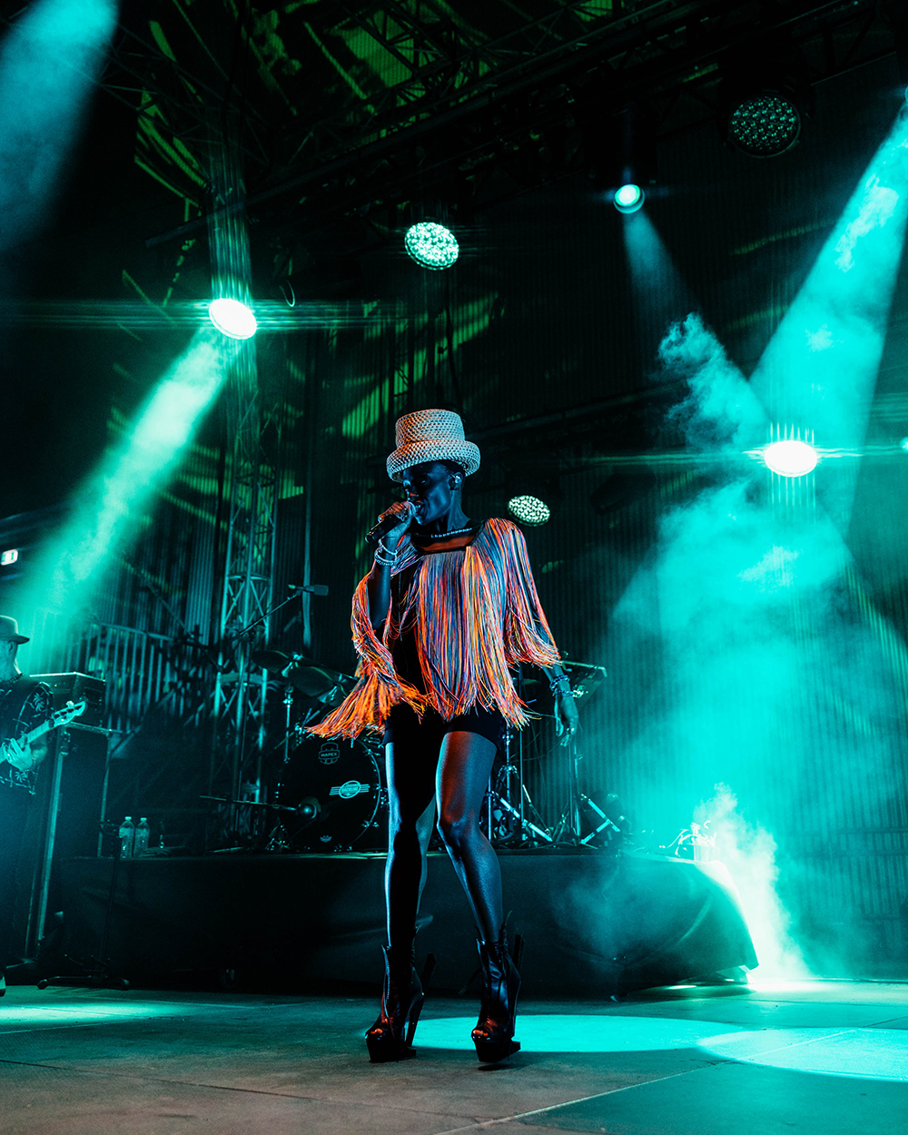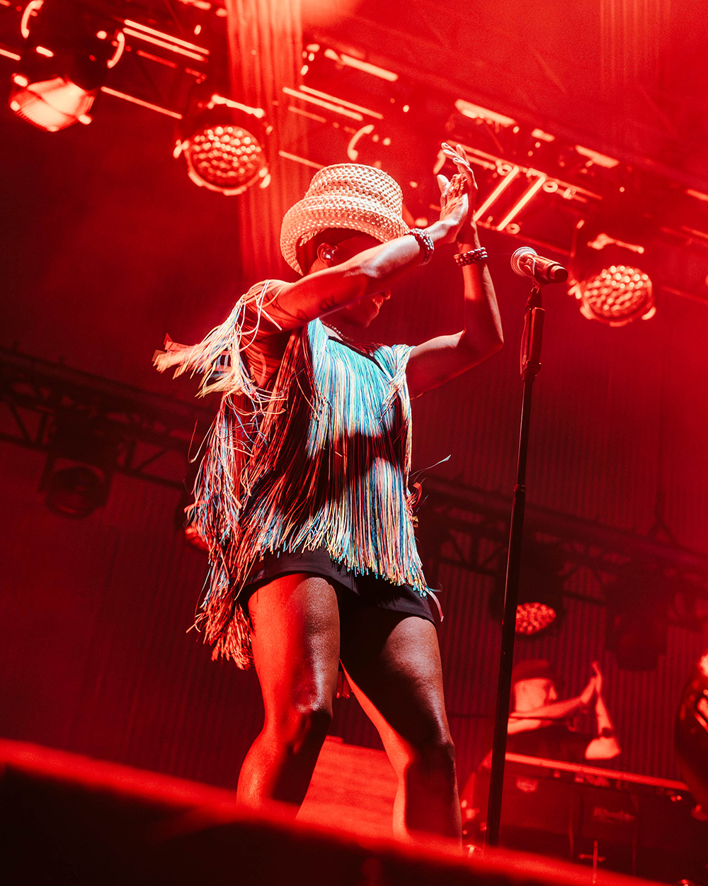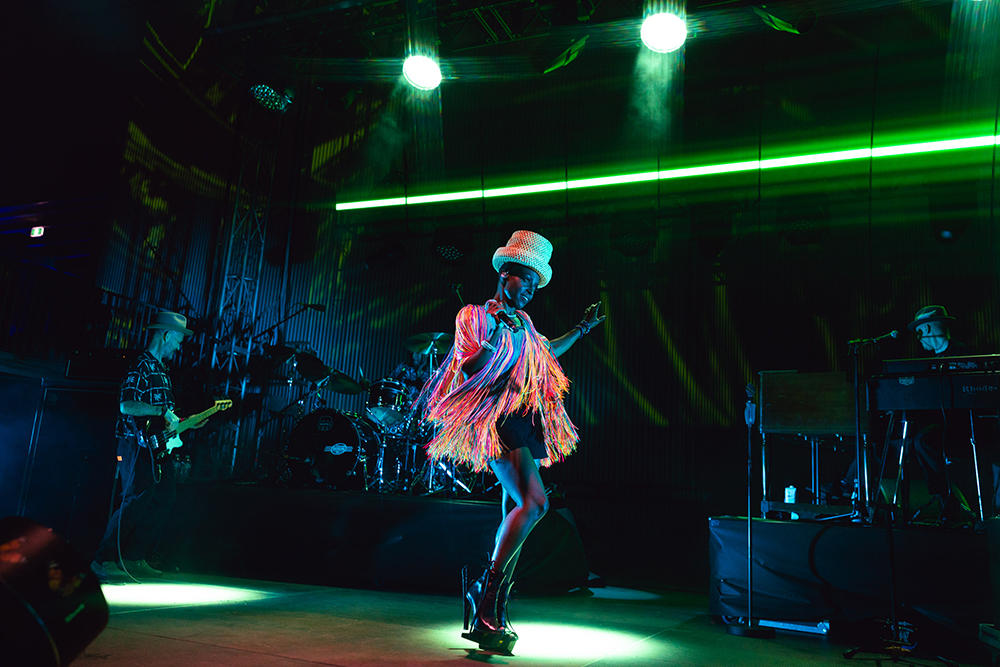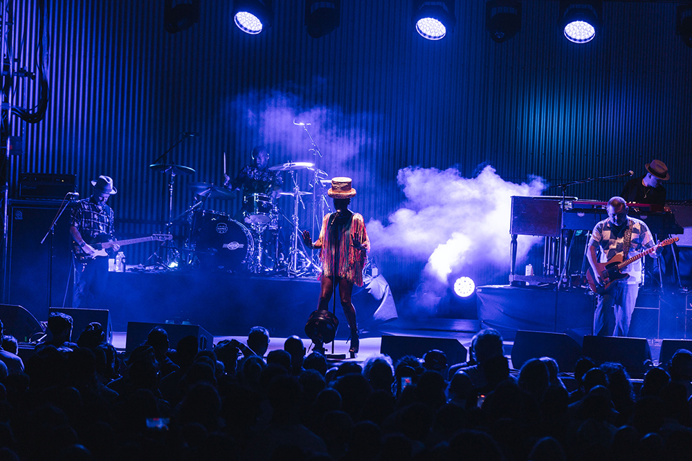 But everyone was here for Morcheeba, and it wasn’t long before the stage lit up, dark reds washed the stage as smoke wafted through. The four-piece band took their places and began gently laying into the slow groove of Trigger Hippy—straight into the classics with the first big single from their 1996 debut, Who Can You Trust? Then, slowly emerging from the darkness, centre-stage, Skye Edwards gracefully appeared, inciting cheers from the crowd. Dressed fashionably in a short flowing, stringy dress (which she made herself – Skye’s known for making her own outfits), and a chunky brimmed, straw hat, that hid her somewhat from the light. She took the mic, and captured the crowd from the first delivery of the line “Tune in, drop out of love, pull the trigger.”