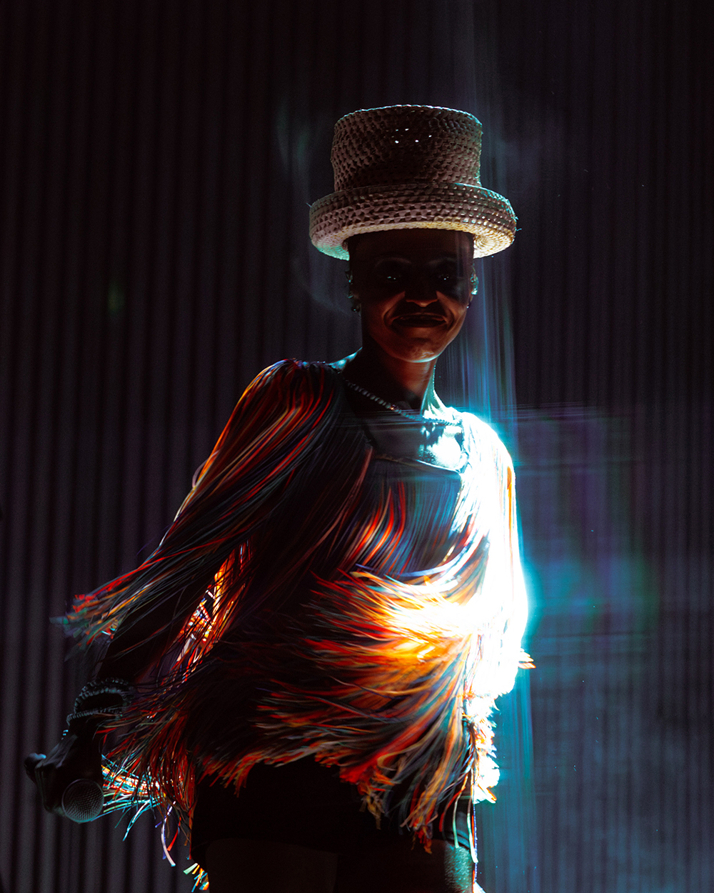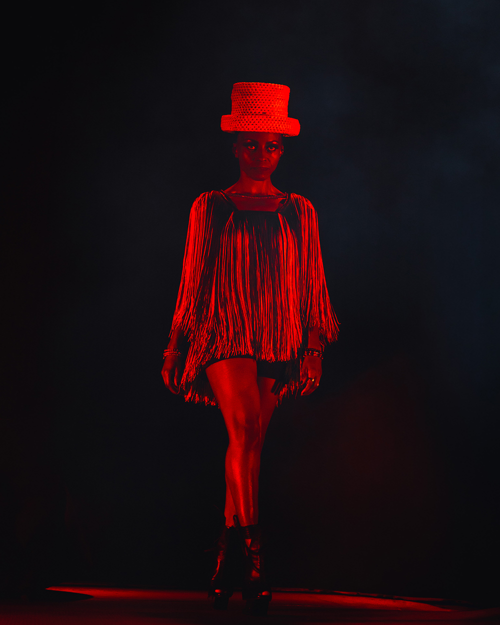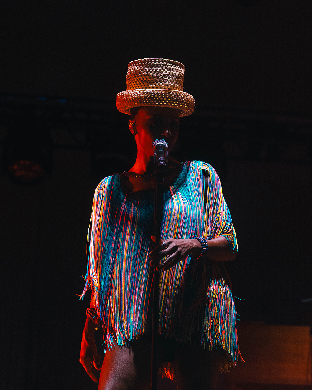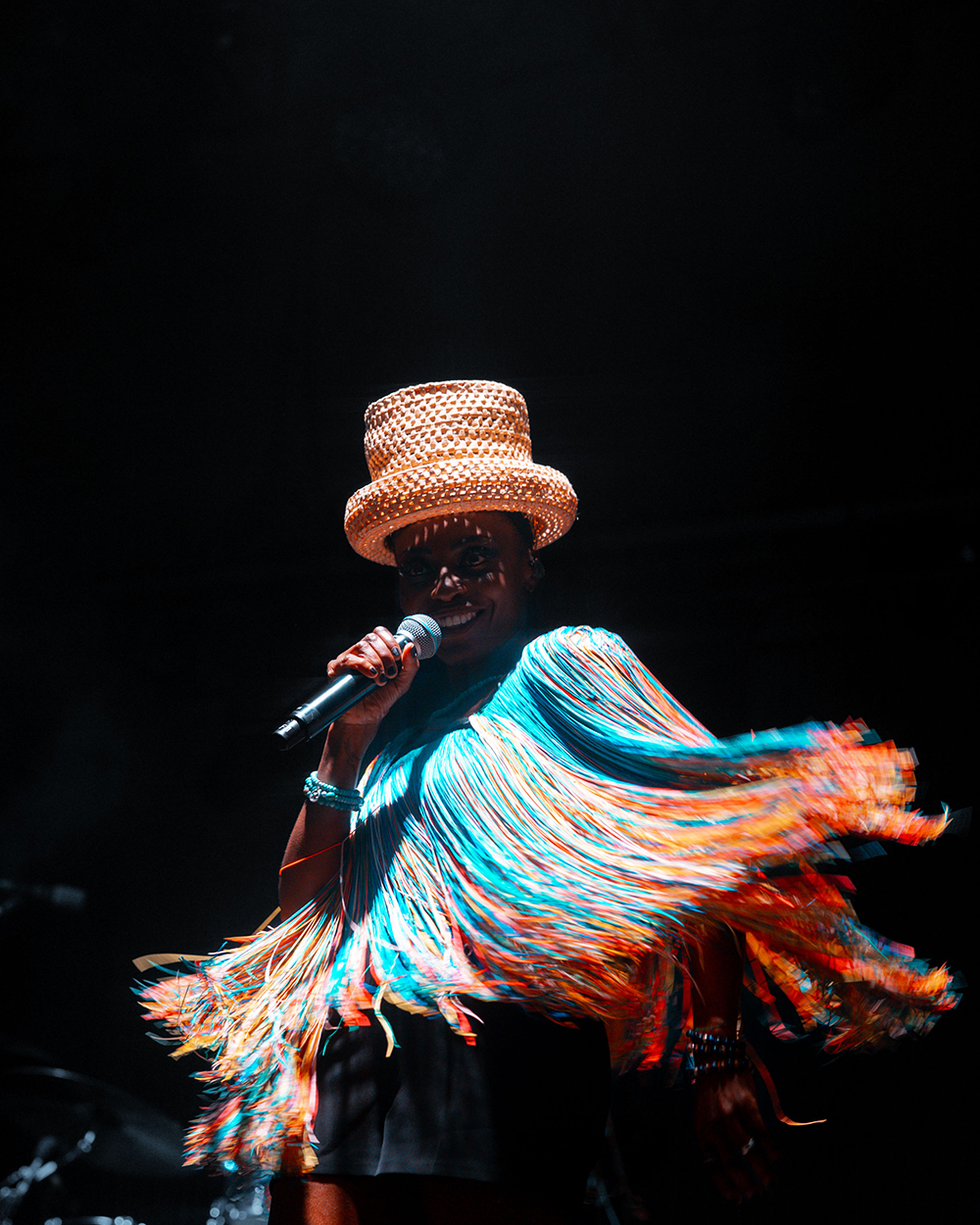 But everyone was here for Morcheeba, and it wasn’t long before the stage lit up, dark reds washed the stage as smoke wafted through. The four-piece band took their places and began gently laying into the slow groove of Trigger Hippy—straight into the classics with the first big single from their 1996 debut, Who Can You Trust? Then, slowly emerging from the darkness, centre-stage, Skye Edwards gracefully appeared, inciting cheers from the crowd. Dressed fashionably in a short flowing, stringy dress (which she made herself – Skye’s known for making her own outfits), and a chunky brimmed, straw hat, that hid her somewhat from the light. She took the mic, and captured the crowd from the first delivery of the line “Tune in, drop out of love, pull the trigger.”