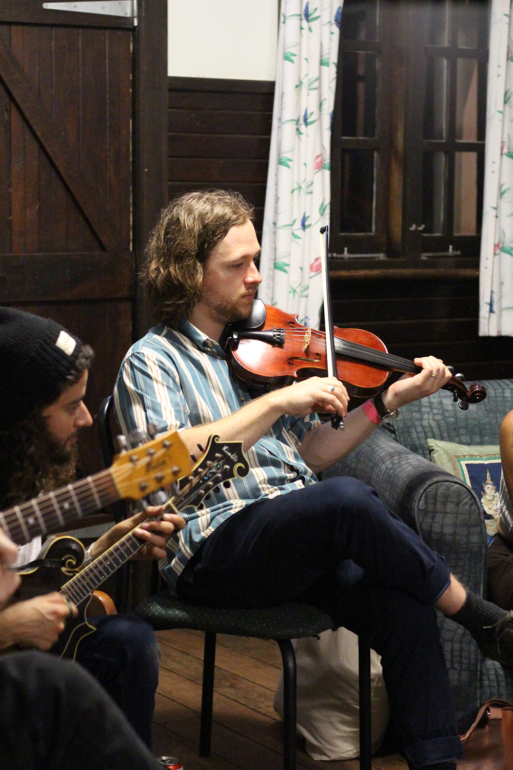 Although it has its roots in folk music, Playmakers goes way beyond that. The two defining features are that all of the music is incredibly sophisticated and performed acoustically. True, there is the odd electric bass, and many of the guitars and violins are amped, but the performances in the Chapel often weren’t, and the extraordinary Ear Trumpet microphone, in itself sufficient for an entire acoustic band, was the mainstay in the Dining Hall.