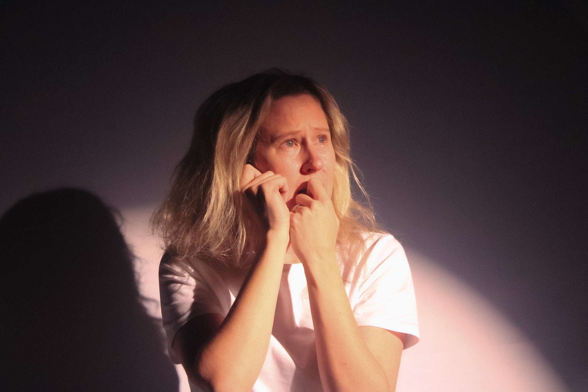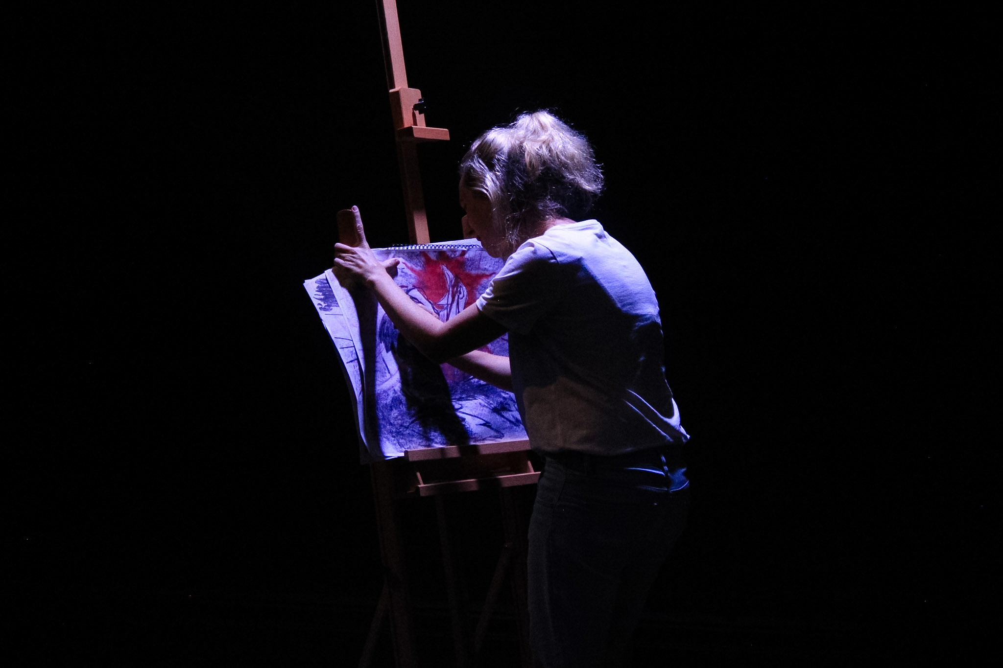 The design team behind Red Ticket is as much to thank for the piece’s excellence as the fabulous performances and writing. Lighting designer Topaz Knodel’s work complements the set design by Setare Moqarabin beautifully. It’s a sparse set, the main feature being a huge canvas in the middle of the room behind which we first encounter Poppy as a backlit silhouette. Poppy’s movements here create gorgeous shapes that sometimes veer into an uncanny Tim Burton-esque territory. Once Poppy pierces the veil, we’re treated to striking moments with red light bathing her face, the use of red being heavily present as a symbol in other moments during her interactions with the set as well. Stunning, flickering transitions disrupt the world of the work during Lily and Poppy’s closer encounters. All of this does a great job of organising the action in Red Ticket between what’s real and what’s happening in Lily’s inner world for the audience. The sound design by Zoe Garciano is effective, providing a steady background thrum that unsettles and puts the audience squarely into Lily’s headspace as she descends into psychosis.