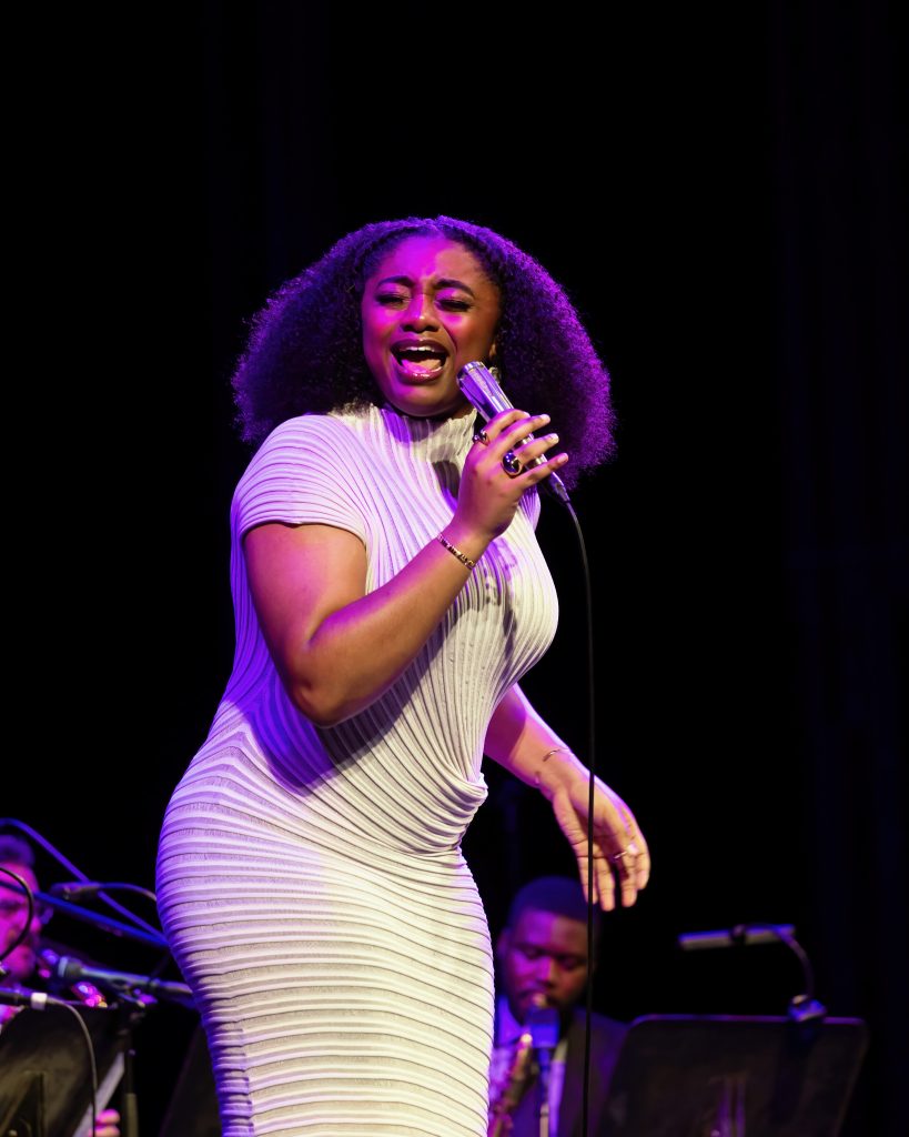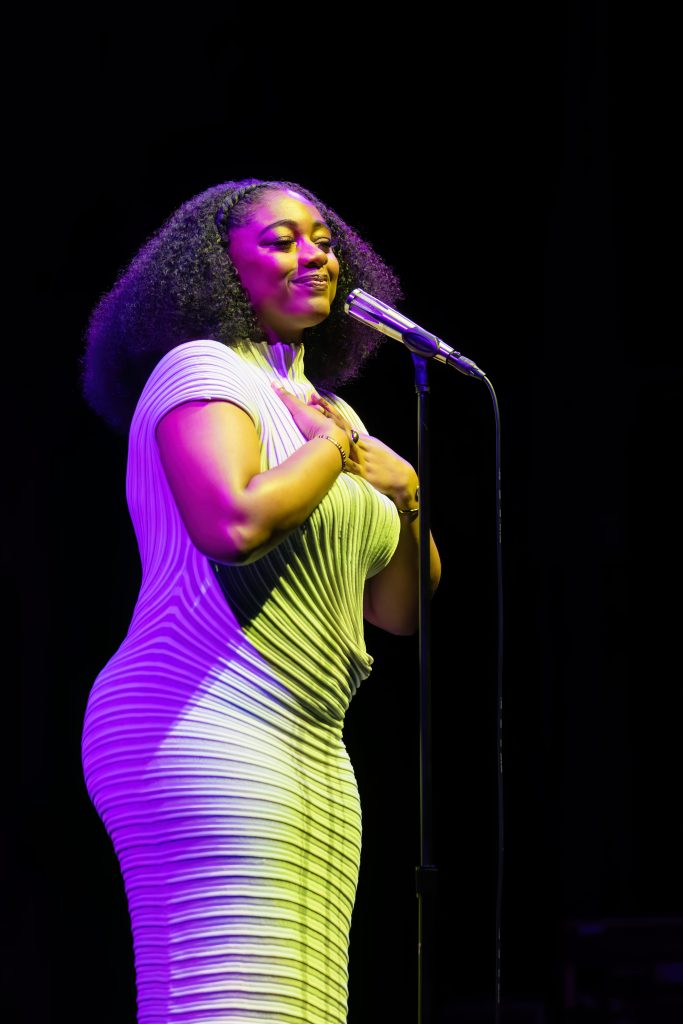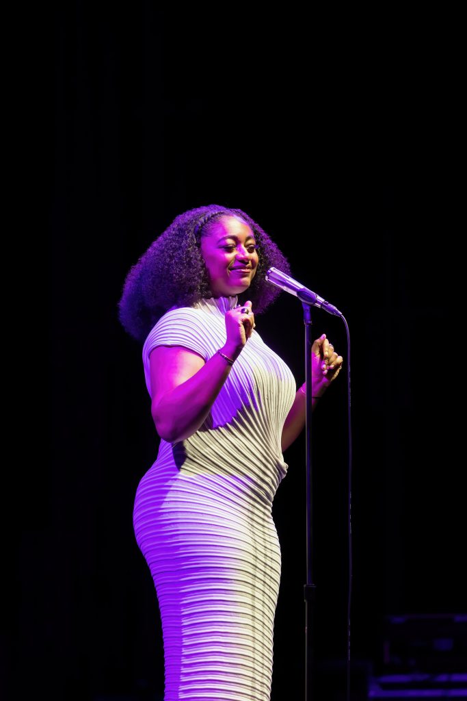 Under a gentle purple glow, the seven-piece band eased into place. Enter Samara Joy: effortless in a white gown, Afro locks flowing, smile warm and grounded. No fuss—just presence. The Regal Theatre’s plush art deco charm met its match in her understated radiance. From the first note, the room was hers.