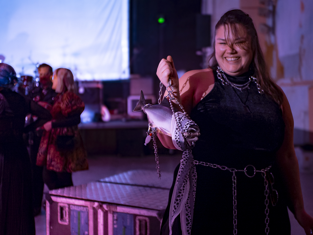 A warped-high-society dress prompt set the tone: goth kids in their finest and punks and couture dabblers milling together while MC Noah Skape ushered us in with immersive cabaret, conjuring ghoulishness and debauched hedonism. Recounting a cautionary parable about excess and the dastardly lure of high society, Skape, with full band in tow, leant into a winked-camp B-grade musical aesthetic before a climax of aerial ring theatrics by a mini-Skape co-performer at the peak of the catwalk stage. It landed like a welcome liturgy for a temporary community—preaching to the already converted, sure, but casting an effective spell all the same.