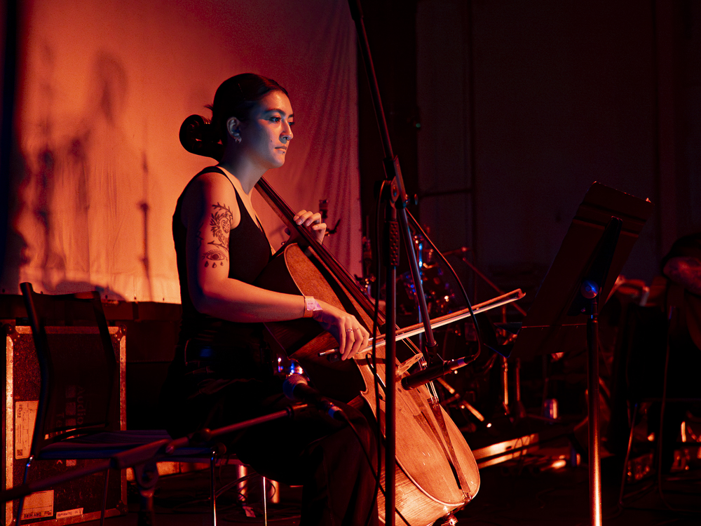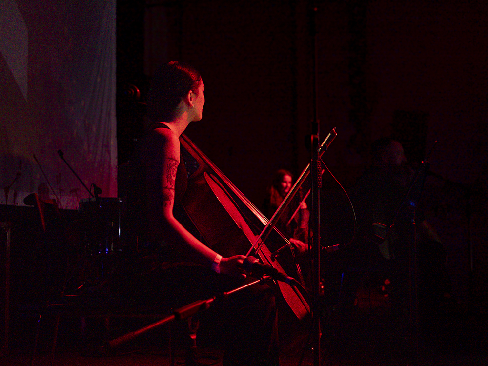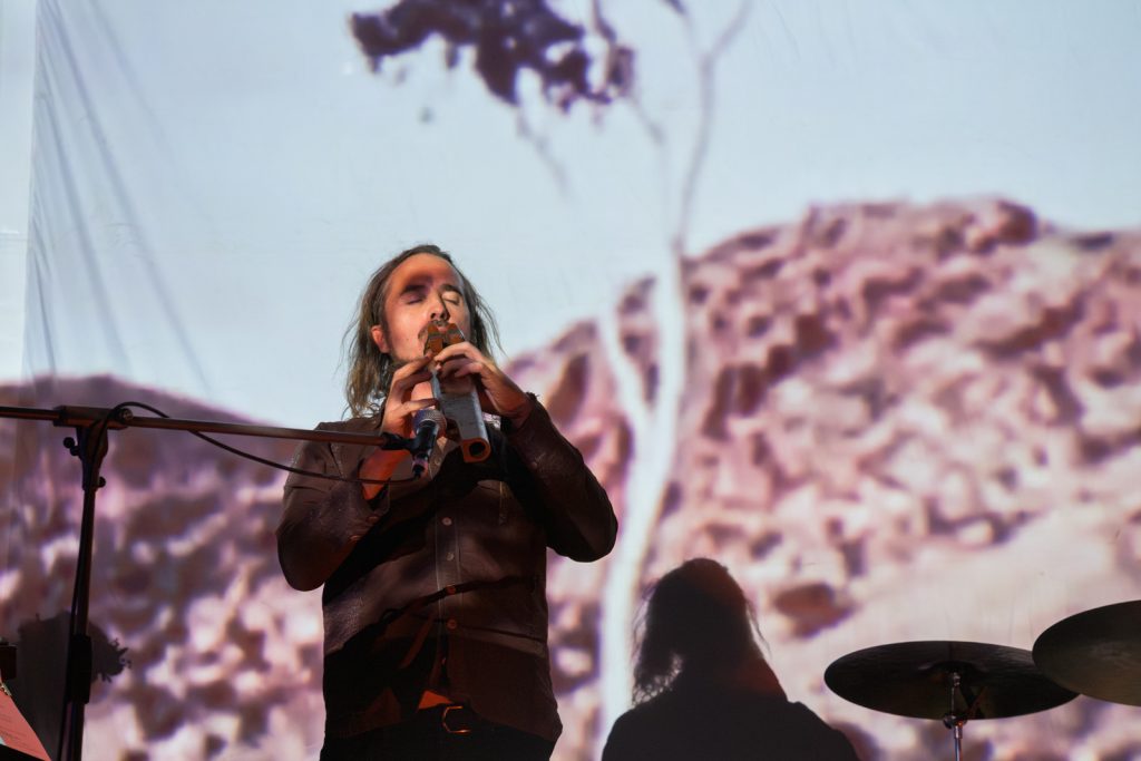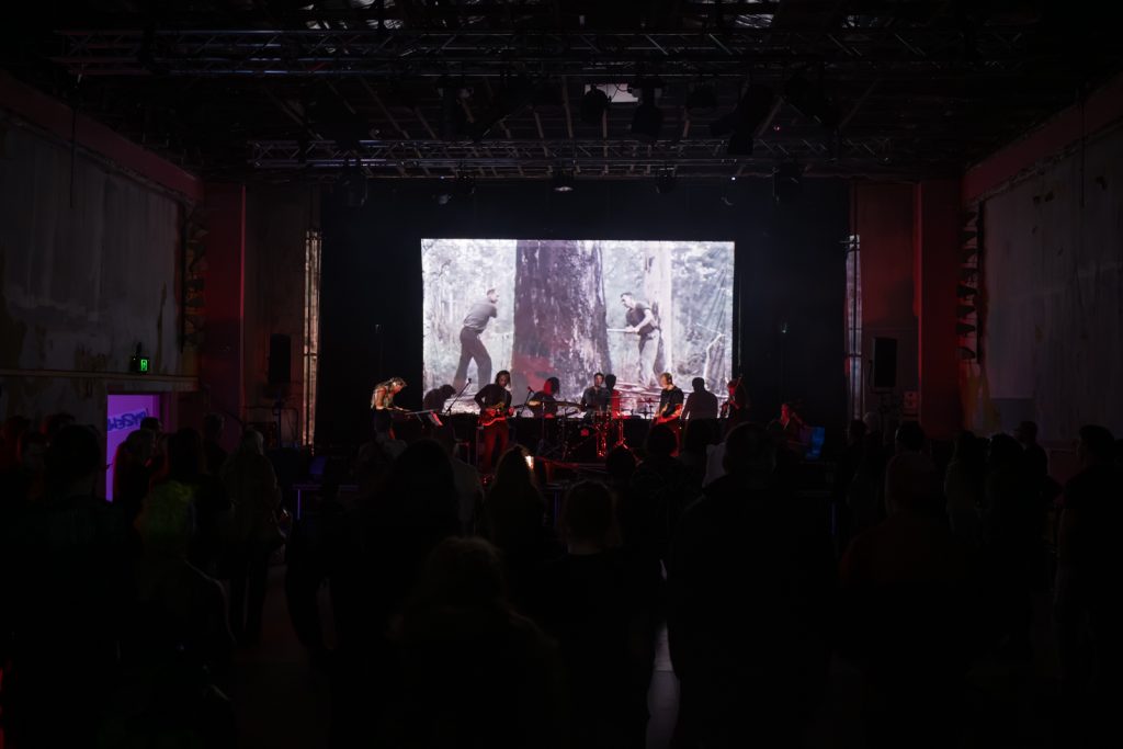 Then the festival’s thesis in long form: Selfless Orchestra launching Terra Nullius as a live cinema-concert. Archival film swept from campfire intimacy to mining machinery, from ethnographic reels to the fallout of Maralinga. Strings whispered, then seethed; a didgeridoo entered mid-set like a hinge. The ensemble’s evocative post-rock rose and broke like weather systems—hope blooming, trains bisecting country, fences torn down—before returning to the crackle of fire. Less a “gig” than a reckoning and motivating call-to-arms, their expression of Terra Nullius was laid across a city shell we’d reanimated for three nights.