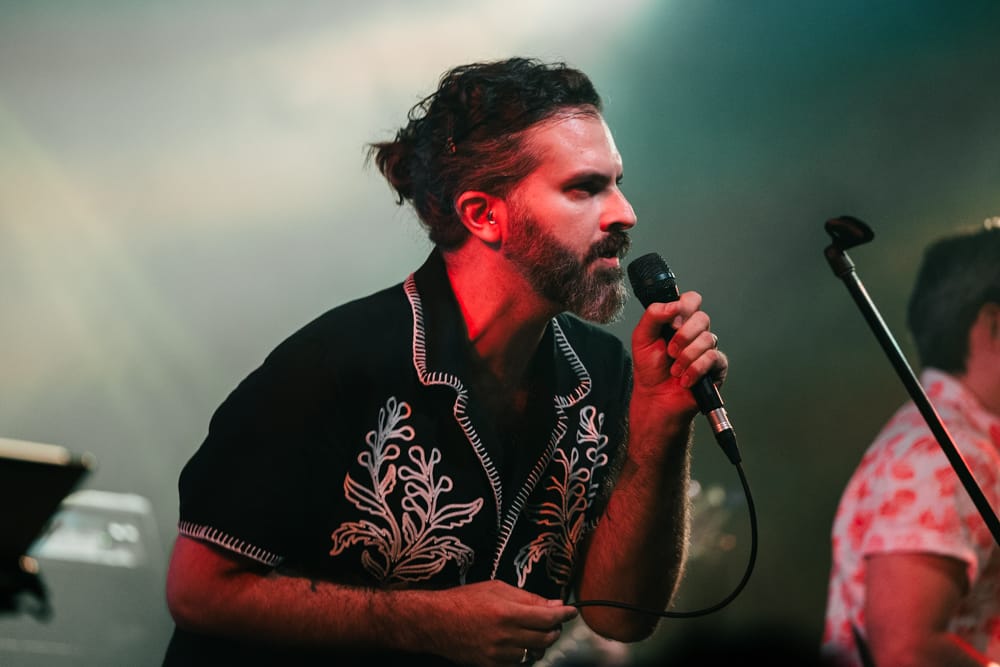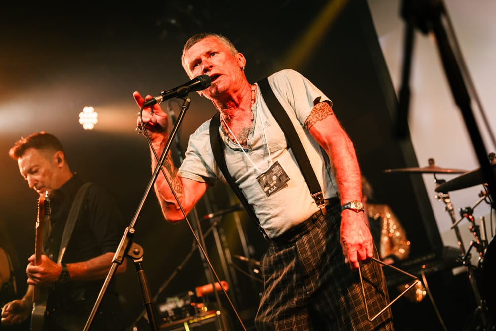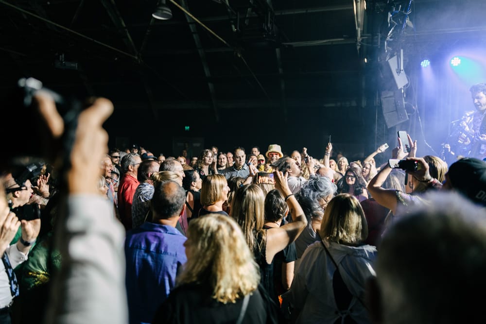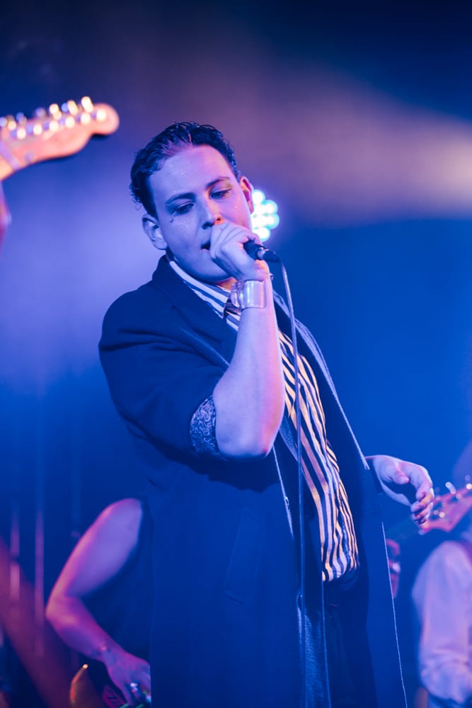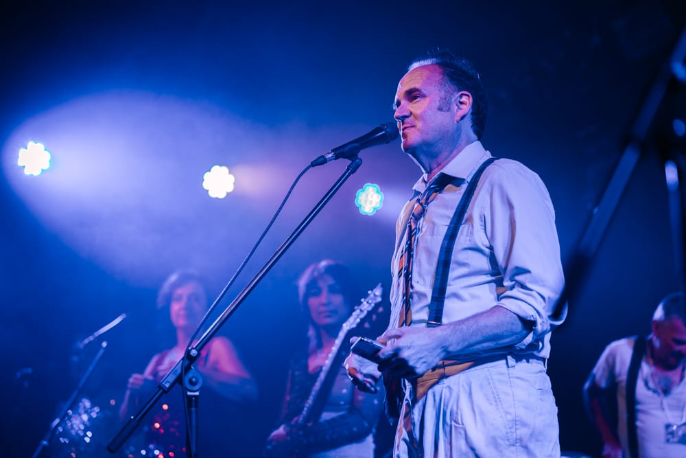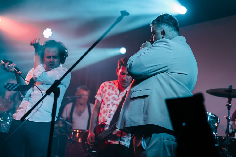 The stage was then given back to England, who not only made it his own but also proceeded to seize the dance floor, the bleachers, and most of the air in the room. Band Four’s pulsating delivery of Jean Genie was accentuated with blasts of Brendan Sturcke’s harmonica as England’s frontman’s antics ranged from crooning to the audience with a strategically placed foot on the foldback to stomping, gyrating, and convulsing before dropping to his knees. In raising the bravado further on Suffragette City, England leapt into the audience mid-song, clasping his vintage microphone to fervently belt out the rest of the song as he cavorted his way through the throng. After revving up the audience, England paused momentarily before boisterously delivering the final “wham, bam, thank you ma’am”—a lyric he previously professed to be the greatest in contemporary music.