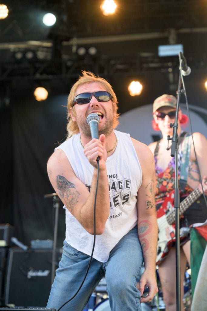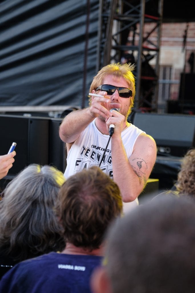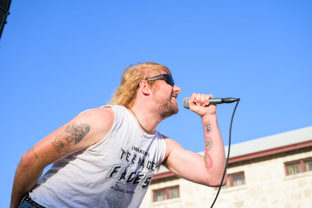 The beginning of the band’s set was fast as hell and included fan favourites Talking to Myself and Give War a Chance. Following this blistering start, Penney polled the audience on their favourite cheap cigarette brand and was subsequently answered with a Manchester Blue durry from the front row. Lighting up and taking a puff, he launched the group into the 80s hair-metal rock of Ready to Be Rich.
