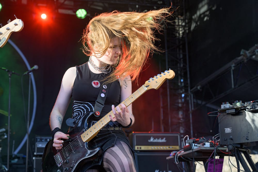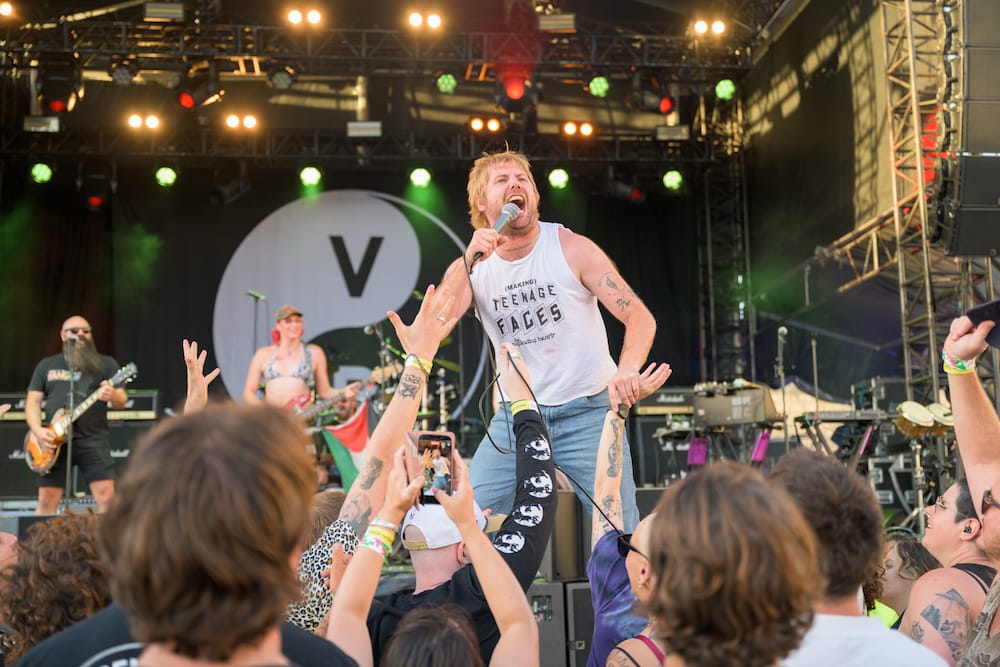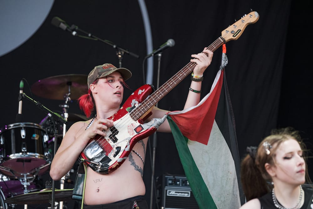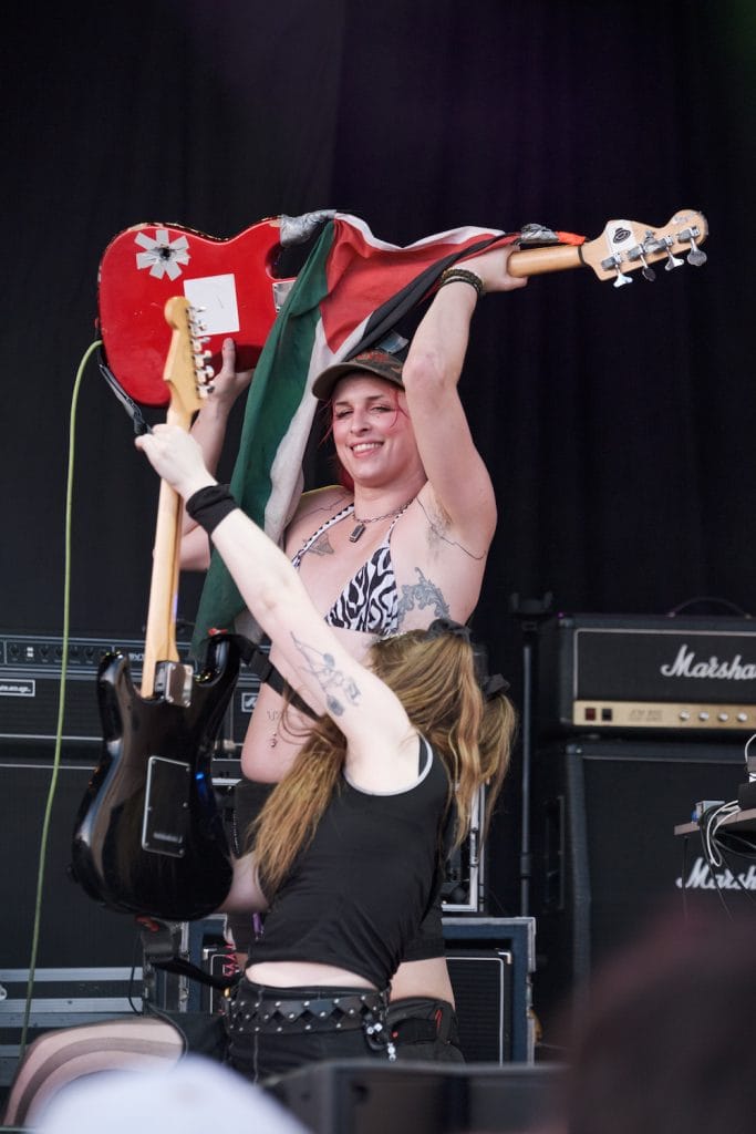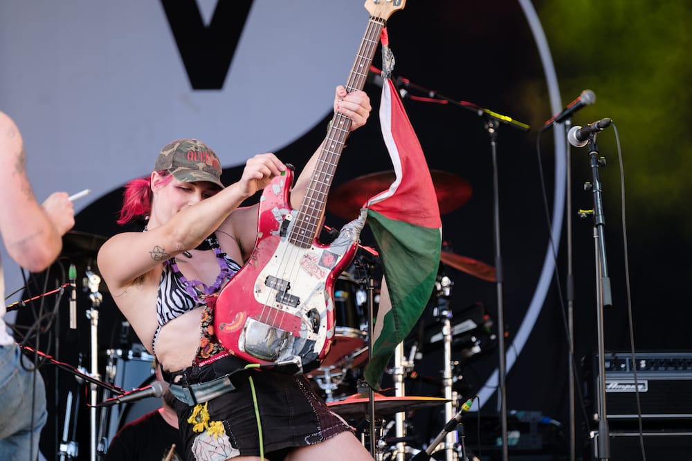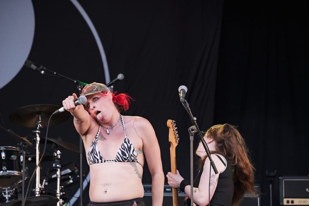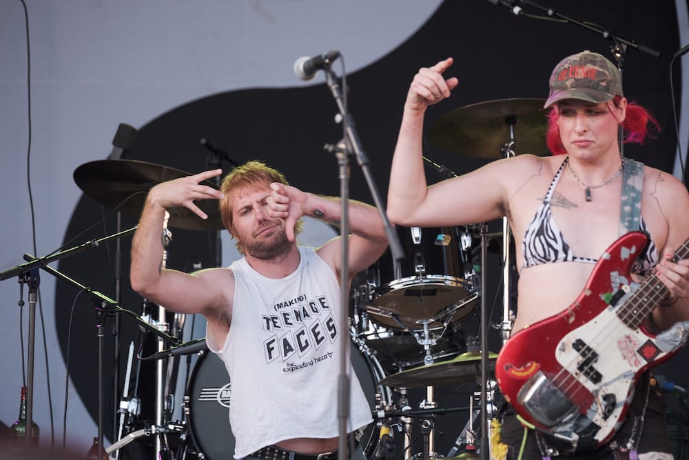 When not on stage, Penney was busy dismantling the fourth wall. For one song he was busy serving Jameson straight from the bottle to the front row, while during Koala he was amidst the pit, embracing punters to enact the song’s lyrics like “I want to put my arms around you, like a big koala.” It was not only Penney, however, that embraced the crowd. Towards the back end of the set, bassist Milla Holland handed over her instrument to clench the mic with both hands and lead the group through some of their most vitriolic works, such as Dumpster Diving Scrap Slut. While Holland’s vocals were unfortunately low in the mix, the excess of anger and energy in her movements more than sold the message.