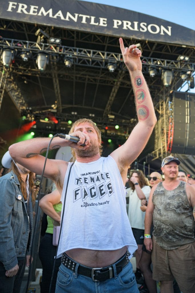 The walls of Fremantle Prison have absorbed plenty over the decades, but the unruly chaos unleashed by Viagra Boys was something else entirely. Marking the Swedish band’s first visit to the west coast of Australia as part of their Infinite Anxiety tour, the prison was the perfect venue for the sardonic sextet, a fact not lost on the band as frontman Sebastian Murphy exclaimed, “They finally let us into Perth. And it’s in a fucking prison!”