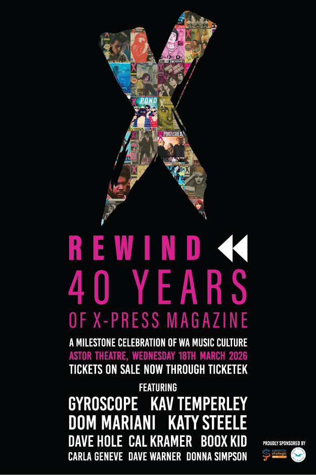Rewind: 40 Years of X-Press Magazine is a stunning, limited-edition 200-page coffee table book written by former X-Press editor Bob Gordon. This commemorative book takes a deep dive into the X-Press archives to unearth the gigs, artists and stories that defined Western Australia’s vibrant arts culture from 1985 to 2025.