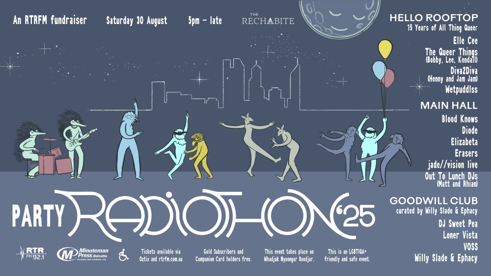 RTRFM’s Radiothon Party hits The Rechabite on Saturday, August 30. Tickets are available now from rtrfm.oztix.com.au