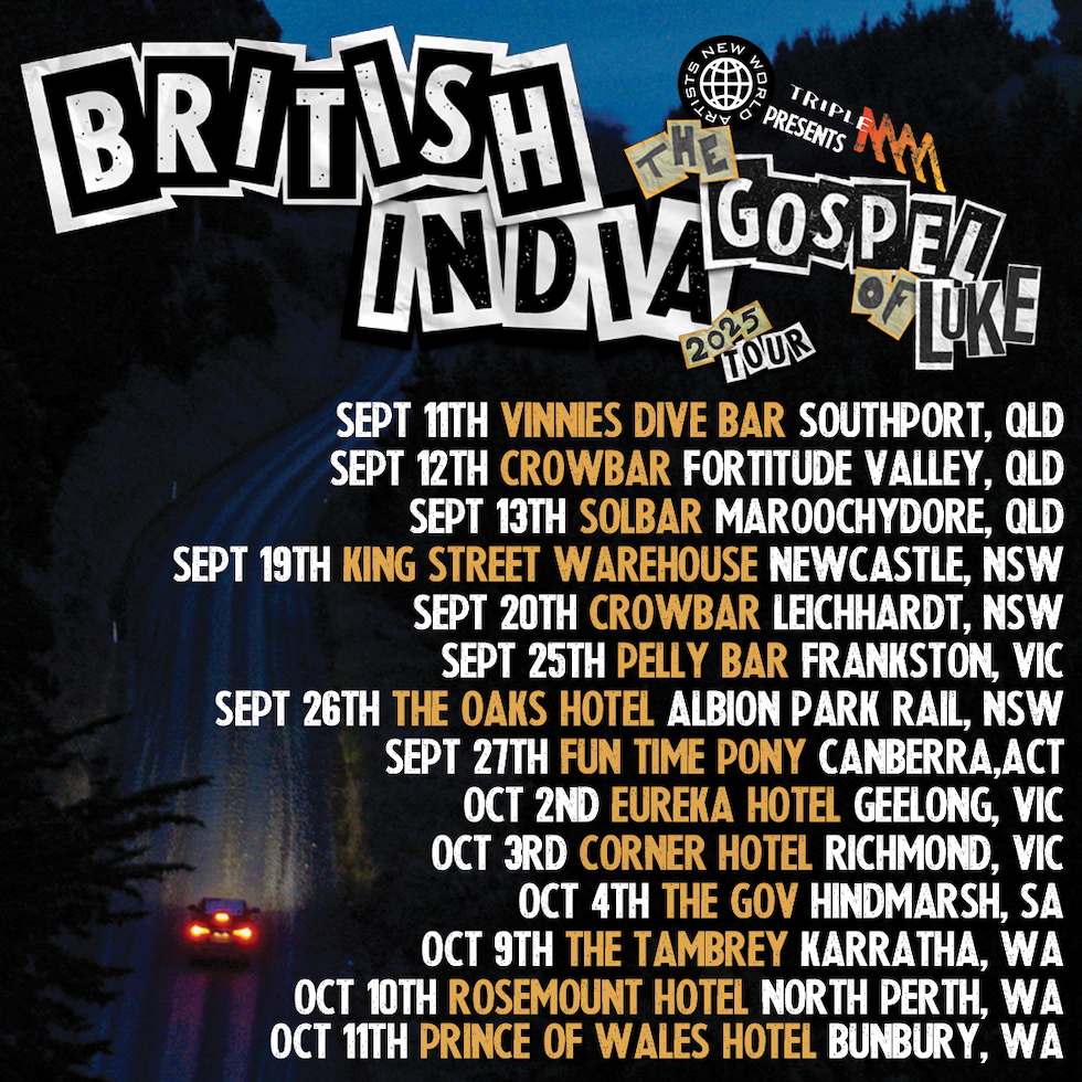 British India bring their The Gospel Of St Luke tour to The Tambrey in Karratha on Thursday, October 9; Rosemount Hotel on Friday, October 10; Prince of Wales in Bunbury on Saturday, October 11; and Indian Ocean Hotel on Sunday, October 12, 2025. Tickets are on sale now from oztix.com
