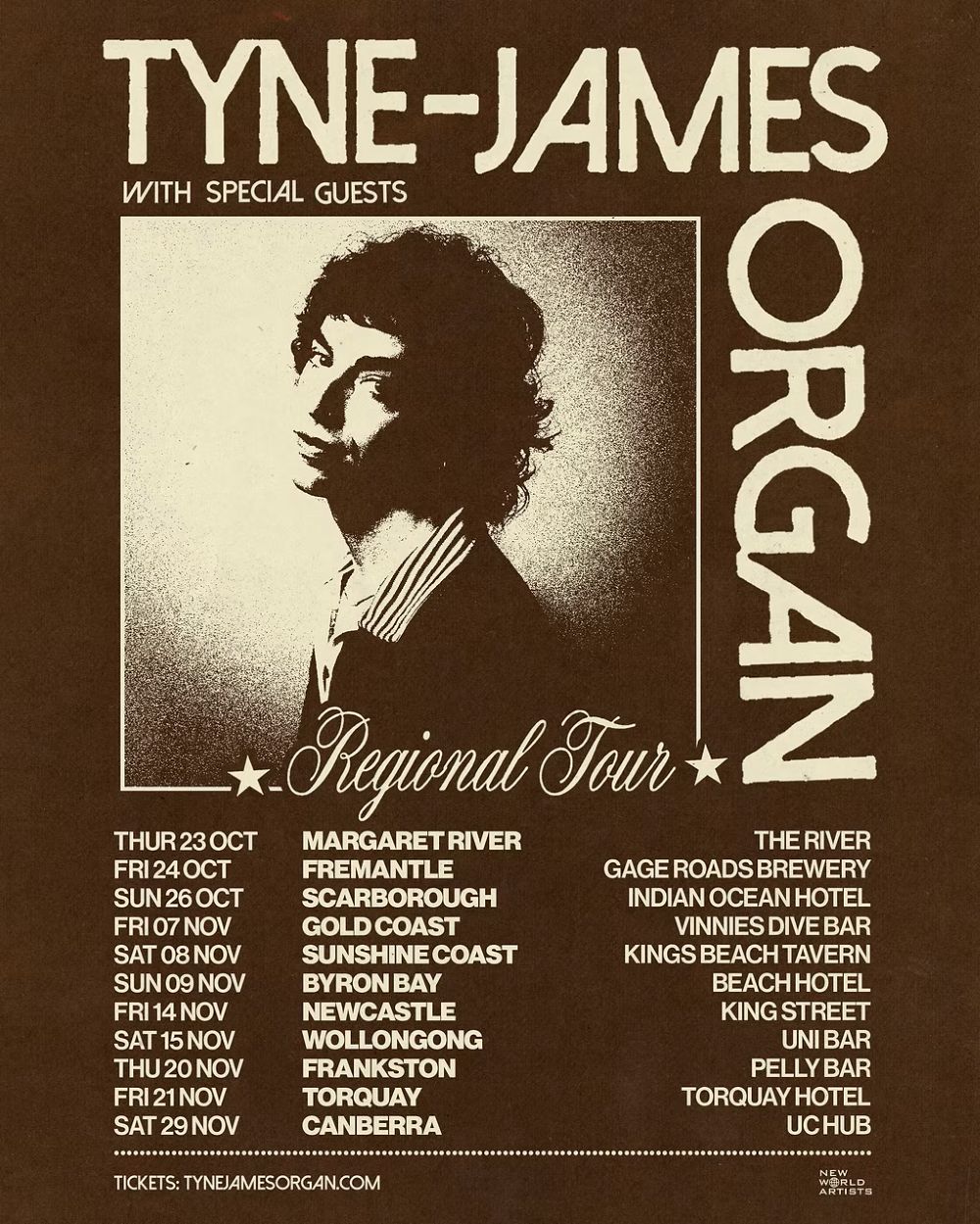 Tyne-James Organ hits The River in Margaret River on Thursday, October 23; Gage Roads Brewery in Fremantle on Friday, October 24; and Indian Ocean Hotel in Scarborough on Sunday, October 26. Tickets are on sale now from tynejamesorgan.com