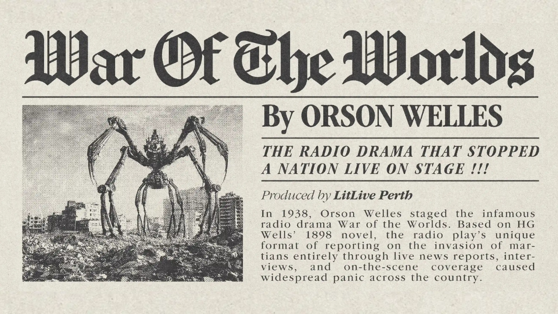 Orson Welles’ War of the Worlds is showing at Venue 360 on Friday, August 1; Saturday, August 2; Friday, August 8; and Saturday, August 9, 2025. Tickets are available from humanitix.com